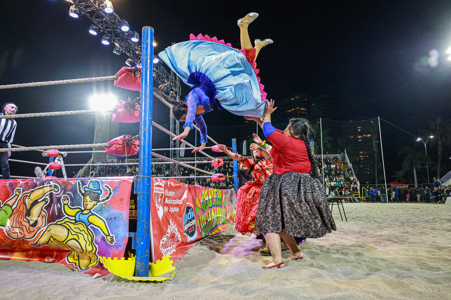 Durante dos noches, las “Cholitas Luchadoras” demostraron su destreza y valentía sobre y bajo el ring del Arena Cavancha, cautivando a todos los presentes con sus acrobacias y técnicas de lucha libre, en presentaciones traídas a la capital de Tarapacá por la Ilustre Municipalidad de Iquique, a través de su Dirección de Turismo Sustentable y Fomento Productivo.